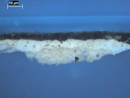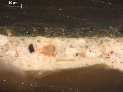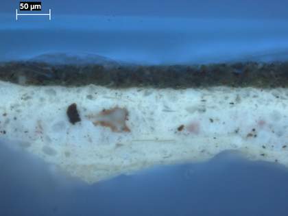 Cross-section through green foliage at the top left corner, photographed at x320 magnification. From the bottom upwards: chalky ground; opaque pale grey ground; green paint of foliage