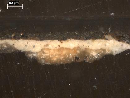 Cross-section through the brown background at the right edge, photographed at x320 magnification. From the bottom upwards: chalky ground; opaque pale grey ground; brown paint of background