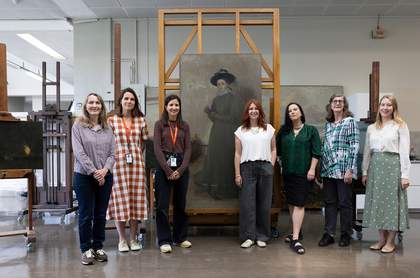 The Whistler's Finish project team in the Tate Britain Conservation Studio with Miss Agnes Mary Alexander c.1873 and Nocturne: Black and Gold – The Fire Wheel 1875