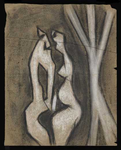 Sketch of two abstract figures facing one another, one female