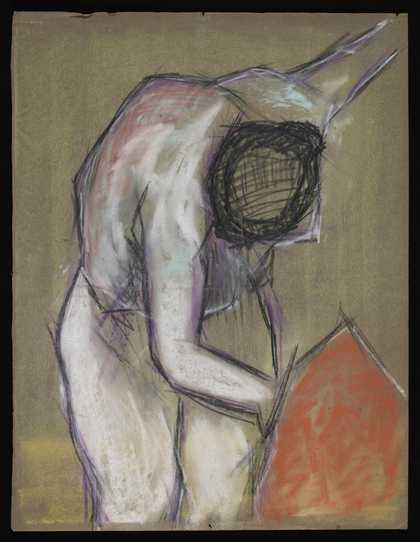 Sketch of a female nude bending down with one arm outstretched behind her and the other reaching into a red pot or box