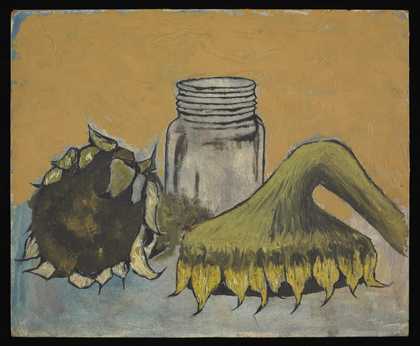 Painting of sunflowers next to a glass jar