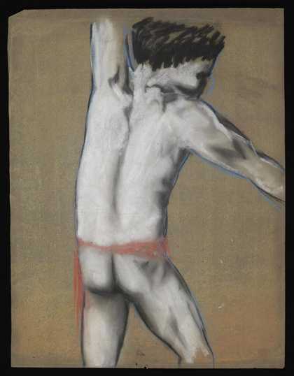 Sketch of a male nude from behind wearing a red loincloth with one arm raised and the other outstretched