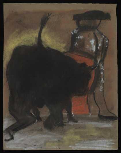 Sketch of a bull charging at a bullfighter holding a red cape