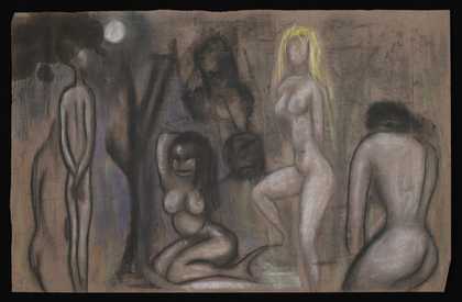 Stylised sketch of an unidentifiable scene, including a female figure on the right-hand side