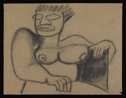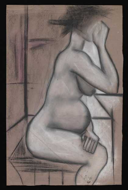 Sketch of a pregnant female nude seated at a table with one hand obscuring her face