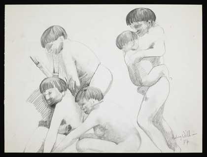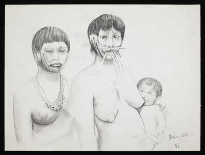 Sketch of two Amerindian women, one with facial piercings breastfeeding a baby