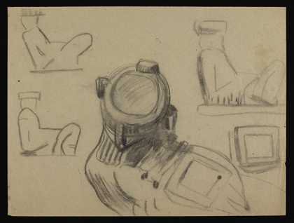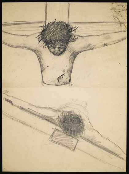 Sketch of Christ on the cross viewed from directly above and a more detailed sketch of his face and torso