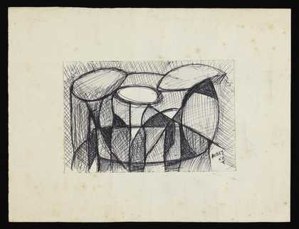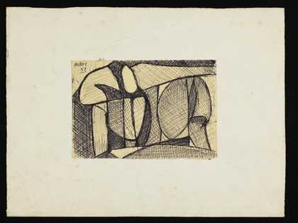 Abstract drawing of geometric shapes with some areas cross-hatched in ink