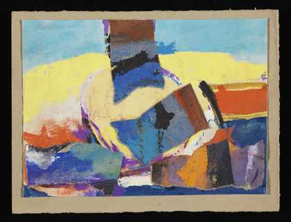Collage consisting of painted pieces of paper or card cut up and glued to a background painted in shades of blue, yellow and red