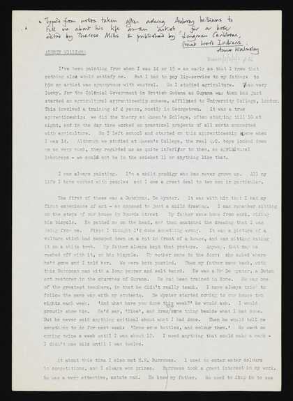 Available online are all of Aubrey Williams' works on paper in this collection which reflect key periods and themes in his artwork, including his interest in Amerindian artwork and culture. Other items which have been digitised include interviews with Williams in which he discusses his life, career and interest in art.