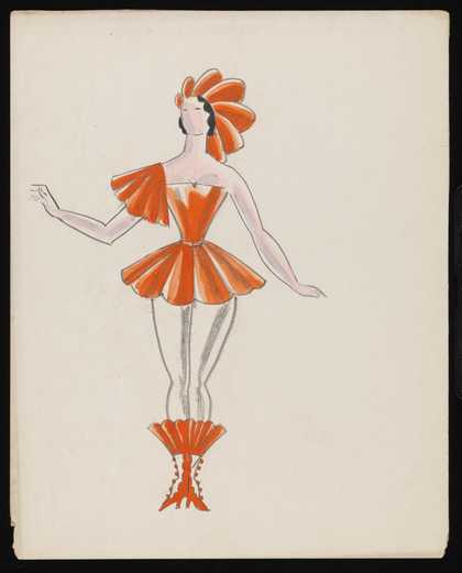 Untitled costume design showing a woman wearing a short red dress and white tights with matching boots and hat