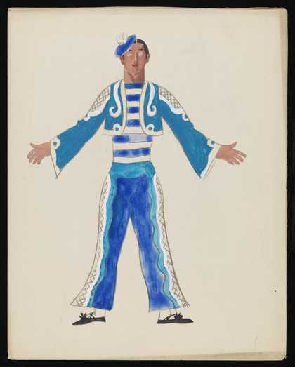 Untitled costume design showing a male figure wearing a blue suit with white piping detail