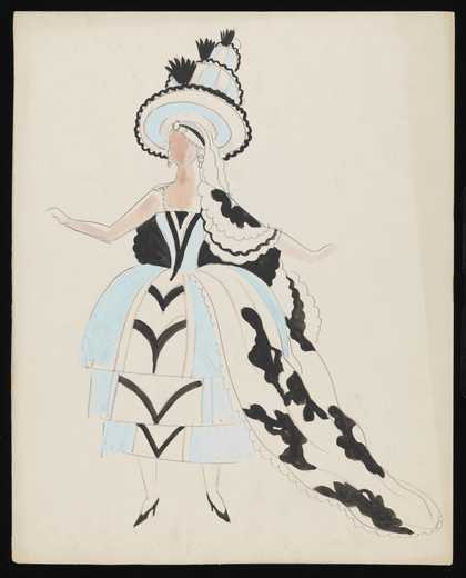 Untitled costume design showing a female figure wearing a blue, black and white dress with a cape, trailing overskirt and large tiered hat