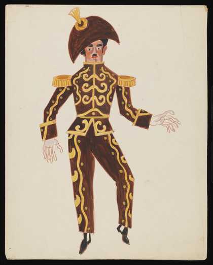 Untitled costume design showing a male figure wearing a black suit with gold piping and decoration with a matching hat