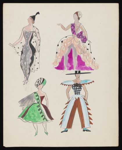 Untitled costume designs for three female figure and one male figure in the style of the Ballet Russe