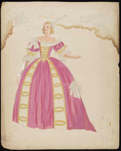 Untitled costume design showing a female figure wearing a yellow dress with a full shirt with pink and red details and a elaborate feather hat