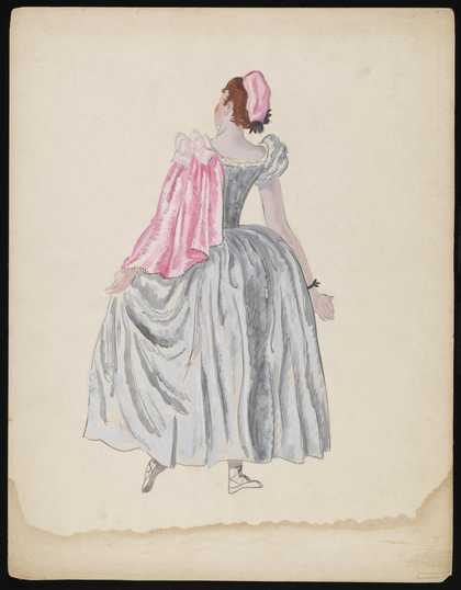 Untitled costume design showing a female figure from behind wearing a grey dress with a pink cape