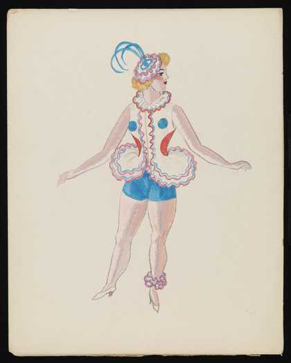 Untitled costume design showing a female figure wearing a white top with red and blue ruffles around the collar and hips, blue shorts and a matching hat in the style of the Ballets Russes