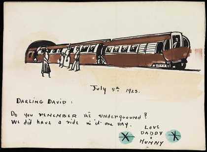 Postcard illustrated with a sketch of an underground train from Anne Estelle Rice and O. Raymond Drey to David Drey