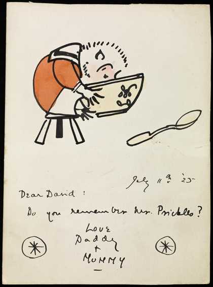 Postcard illustrated with a sketch of a hedgehog eating out of a large bowl from Anne Estelle Rice and O. Raymond Drey to David Drey