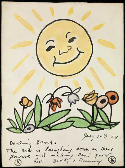 Postcard illustrated with a sketch of a sun with a face and flowers from Anne Estelle Rice and O. Raymond Drey to David Drey