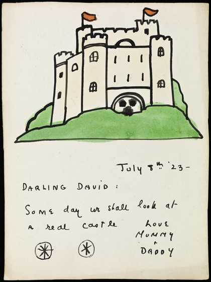 Postcard illustrated with a sketch of a castle from Anne Estelle Rice and O. Raymond Drey to David Drey
