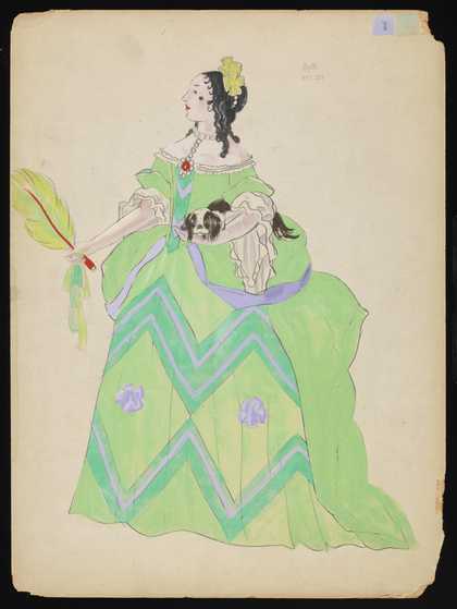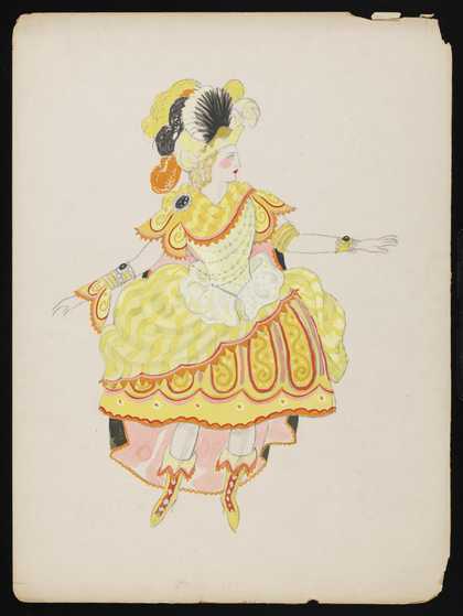 Untitled costume design showing a female figure wearing a yellow dress with a full shirt with pink and red details and a elaborate feather hat