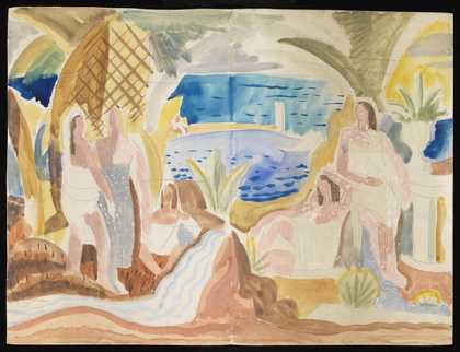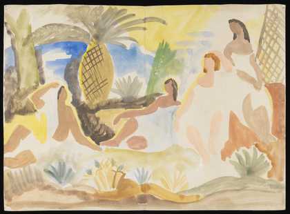 Rolled untitled set design(?) showing five female figures reclining on a beach surrounded by palm trees