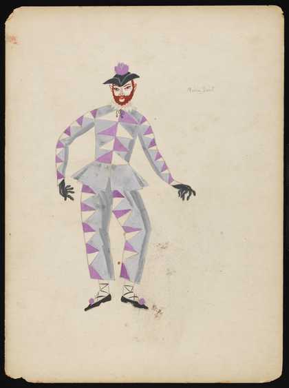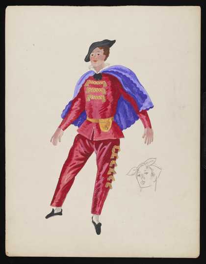 Untitled costume design showing a male figure wearing a red suit with gold tassels and a purple cape