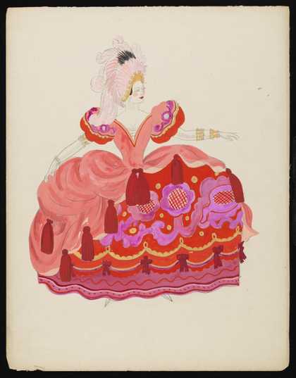 Untitled costume design of a female figure wearing a pink dress with a wide skirt and puff sleeves decorated with large pink flowers and red tassels and bows with a elaborate pink feather hat