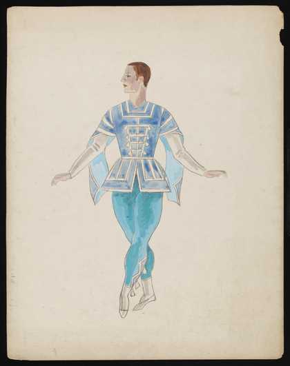 Untitled costume design showing a male figure wearing a blue suit with white piping detail