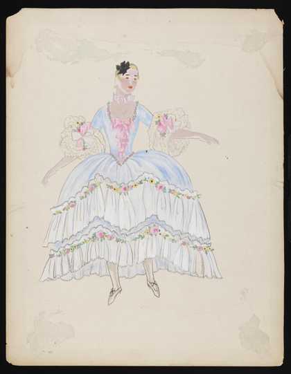 Untitled costume design showing a female figure wearing a blue and white dress with a tiered skirt decorated with flowers and pink bows and lace sleeves