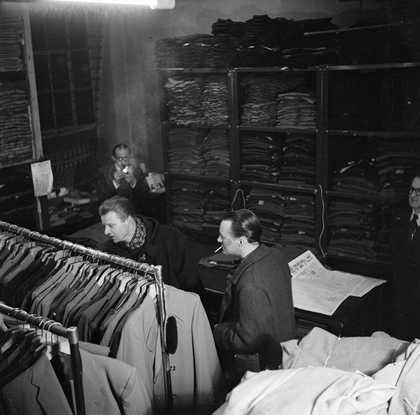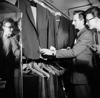 Photograph of Ronnie Scott and two unidentified men in a shop selling men’s clothes