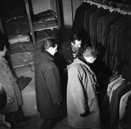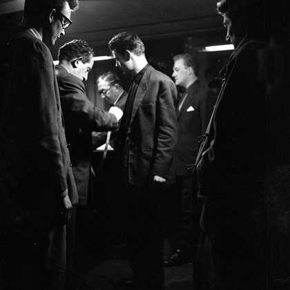 Photograph showing musicians inside a shop selling men’s clothes including Ronnie Scott and Ken Wray
