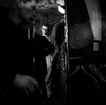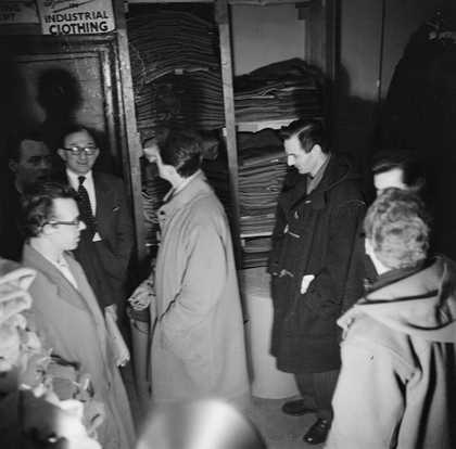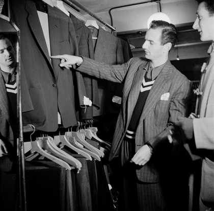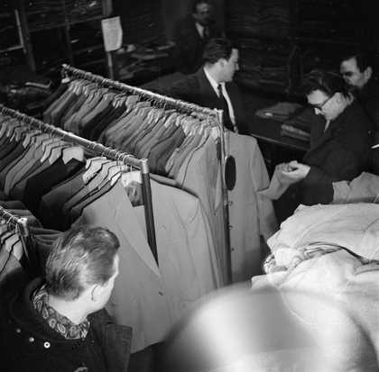 Photograph of Ronnie Scott inside a shop selling men’s clothes