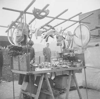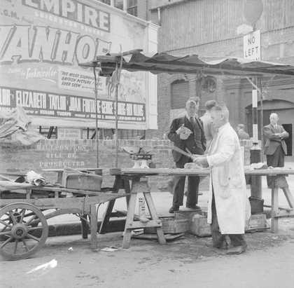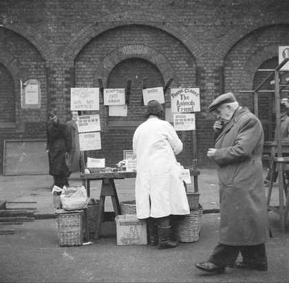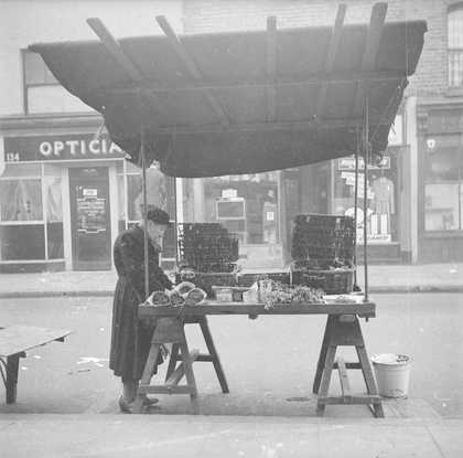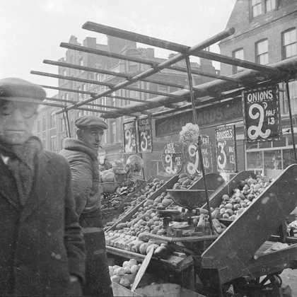 Photograph showing an unidentified man in front of an outdoor market stall on Bethnall Green Road, London