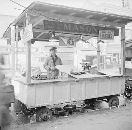Photograph showing an outdoor market stall selling mussels
