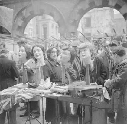 Photograph showing a vendor named ‘Dolly’ with her market stall selling wigs on Petticoat Lane