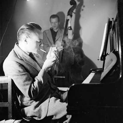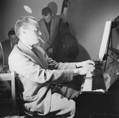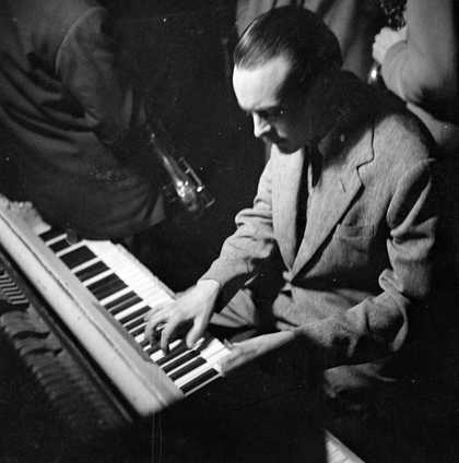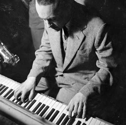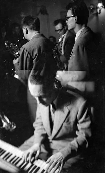 Photograph of a jazz musician peforming on piano and a group of jazz musicians