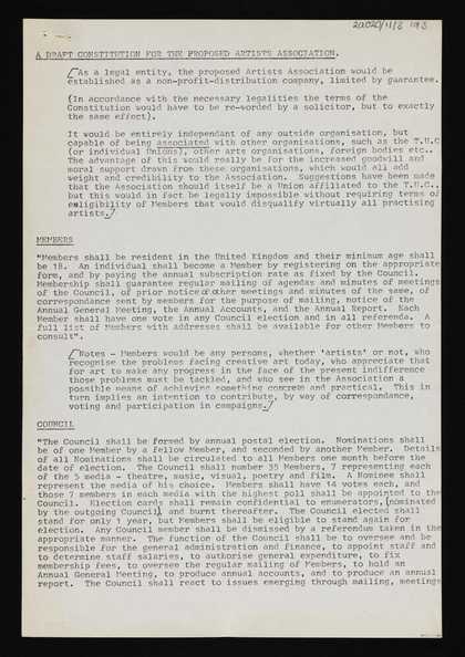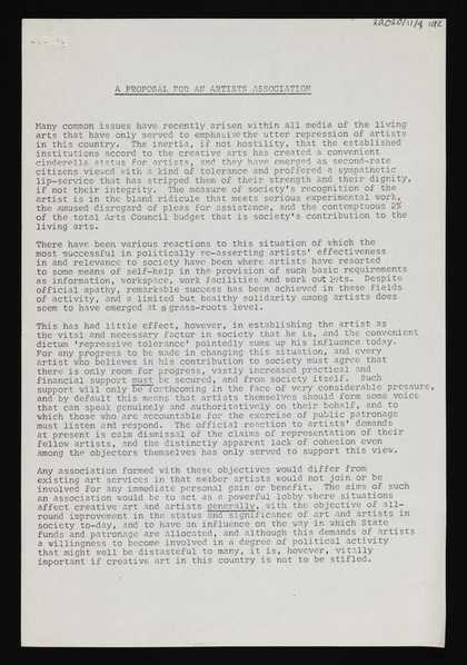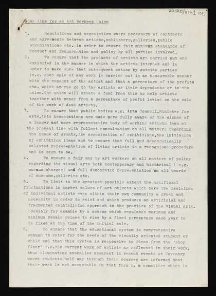 - This file consists of documentation relating to the formation and activities of the Artists' Union. In particular, the material in this file is concerned with meetings between the Art Worker's Union and similar groups regarding the formation of an Artists' Union.