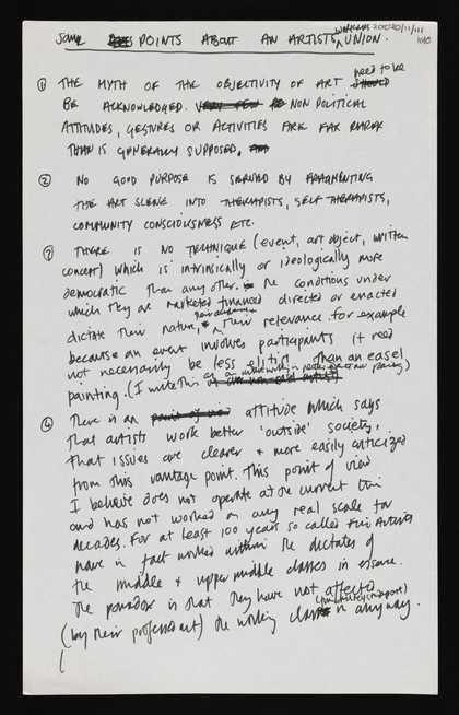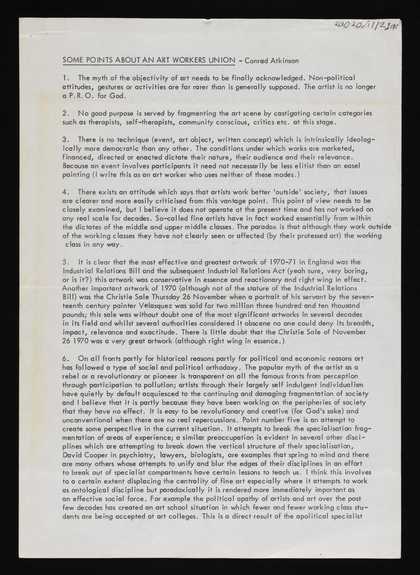 Items chosen from this collection for digitisation include photographs of wall murals, posters, and graffiti Northern Ireland, taken by Conrad Atkinson during the 'Troubles' in the early 1970s, as well as source material and original sketches by the artist for the exhibition catalogue for 'A Shade of Green, An Orange Edge', at the Art Council Gallery, Belfast, 1975. Also chosen are writings and organisational documentation relating to the formation and activities of the Artists' Union.