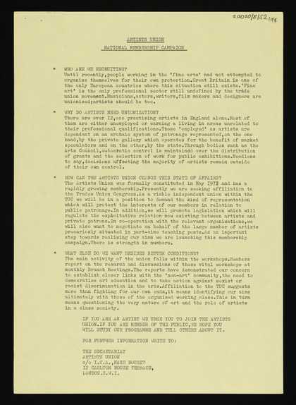 - This file consists of documentation relating to the formation and activities of the Artists' Union. In particular, the material in this file is concerned with the Artists' Union - Women's Workshop', and art education.