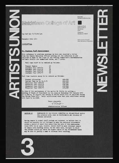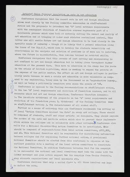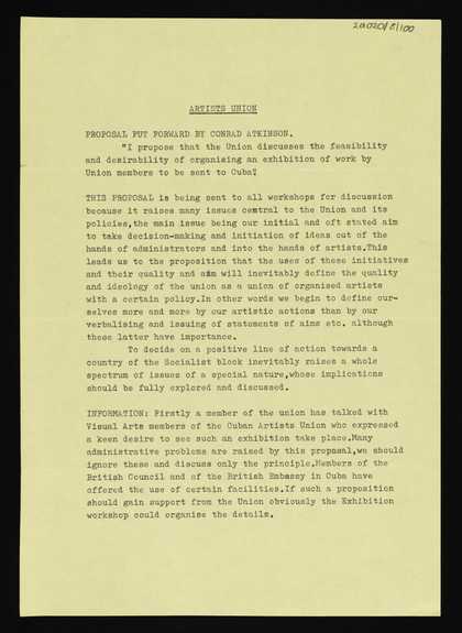 Items chosen from this collection for digitisation include photographs of wall murals, posters, and graffiti Northern Ireland, taken by Conrad Atkinson during the 'Troubles' in the early 1970s, as well as source material and original sketches by the artist for the exhibition catalogue for 'A Shade of Green, An Orange Edge', at the Art Council Gallery, Belfast, 1975. Also chosen are writings and organisational documentation relating to the formation and activities of the Artists' Union.