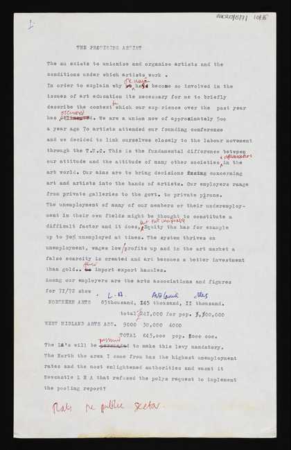 It includes correspondence, writings, notes, agenda and minutes of meetings, Artists' Union newsletters, printed and published material, and press cuttings. - Reference