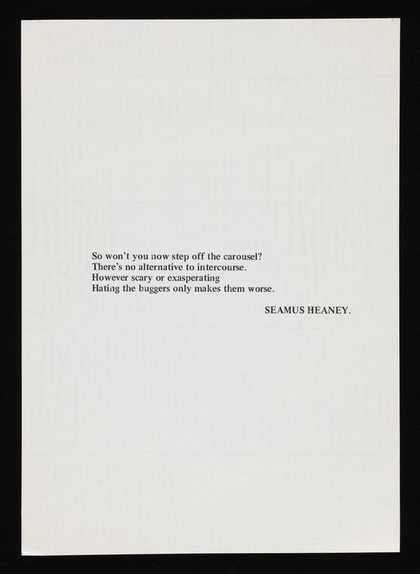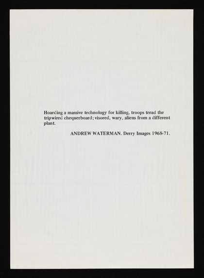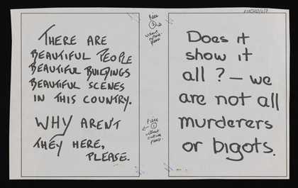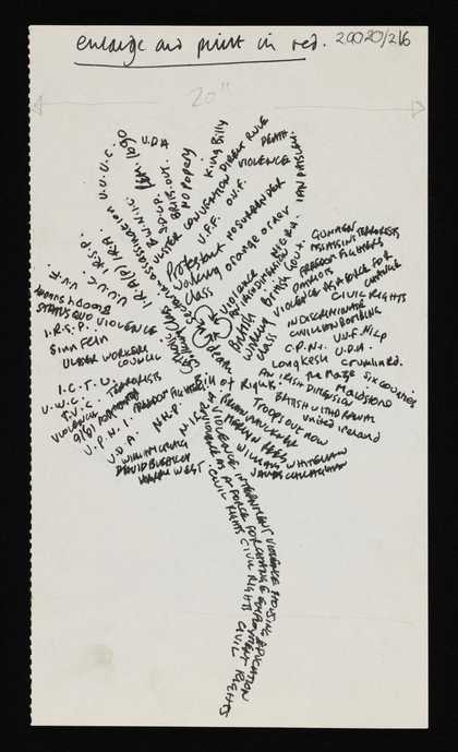 Items chosen from this collection for digitisation include photographs of wall murals, posters, and graffiti Northern Ireland, taken by Conrad Atkinson during the 'Troubles' in the early 1970s, as well as source material and original sketches by the artist for the exhibition catalogue for 'A Shade of Green, An Orange Edge', at the Art Council Gallery, Belfast, 1975. Also chosen are writings and organisational documentation relating to the formation and activities of the Artists' Union.