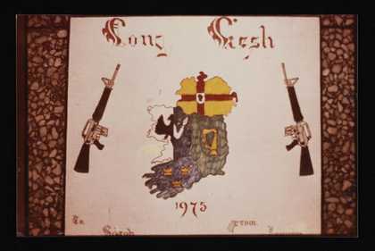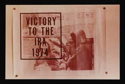 Colour photograph of a poster depicting a paramilitary holding a rifle, children, and the slogan, ‘Victory to the IRA 1974’
