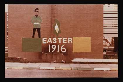 Colour photograph of a wall in Northern Ireland painted with a Republican paramilitary, an Irish flag, and ‘Easter 1916’