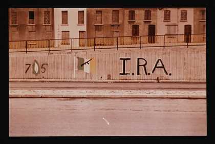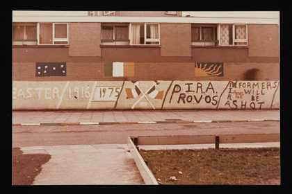 Colour photograph of a wall in Northern Ireland painted with an Irish flag and a rifle, and ‘75 IRA’
