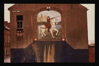 Colour photograph of a wall mural in Northern Ireland depicting King William III on horseback with the words, ‘In God is Our Trust, William III’